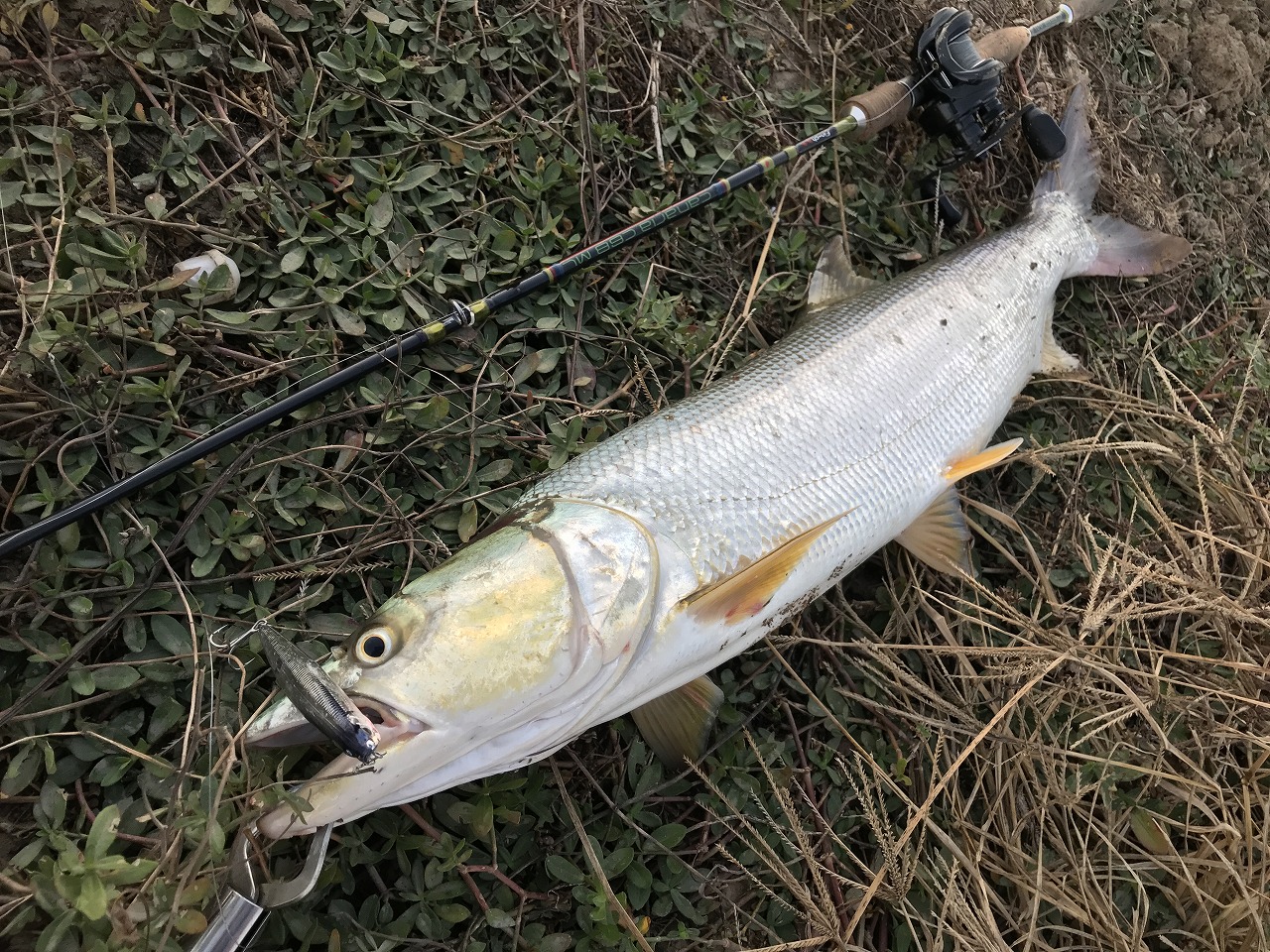 | 珠海の離島にて。 写真はソフトルアーなんだけど、小型バイブレーションでも釣ってます。 安定して回遊しないので、狙って釣るのは難しい。 |