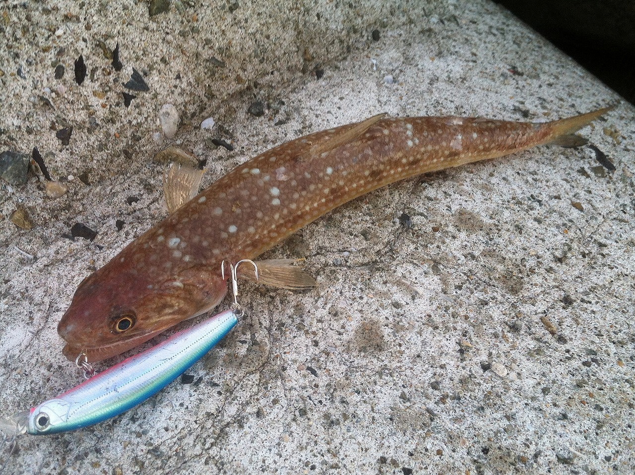 | 珠海の波止場にて。 ルアーで釣れたのはレアケース。 コメントの難しい魚っす。 |