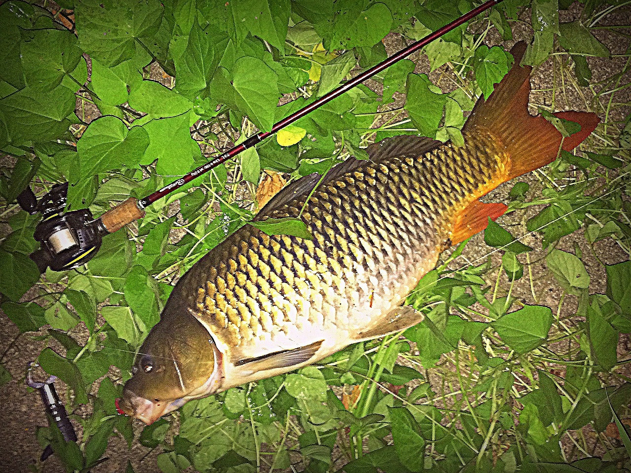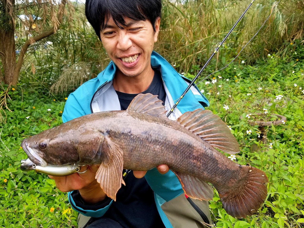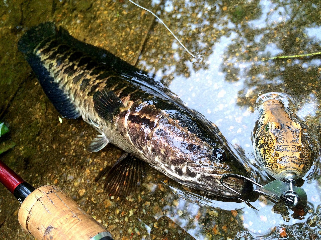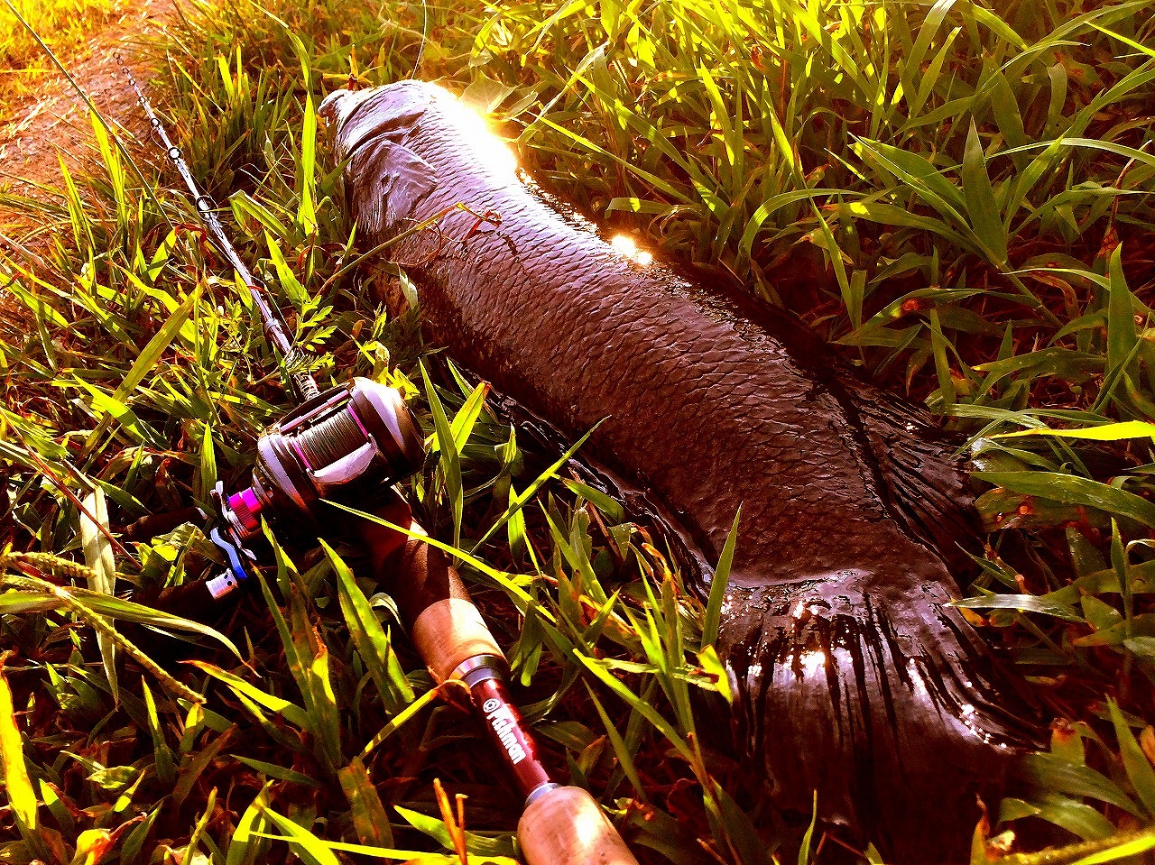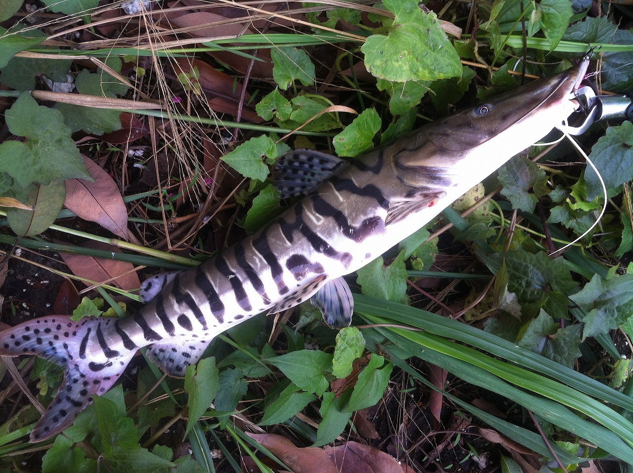 | 地元下関の河川にて。 使用ルアーはタイで買ったスネークヘッド用。 これを釣った後、この川で雷魚を確認できてない。 |