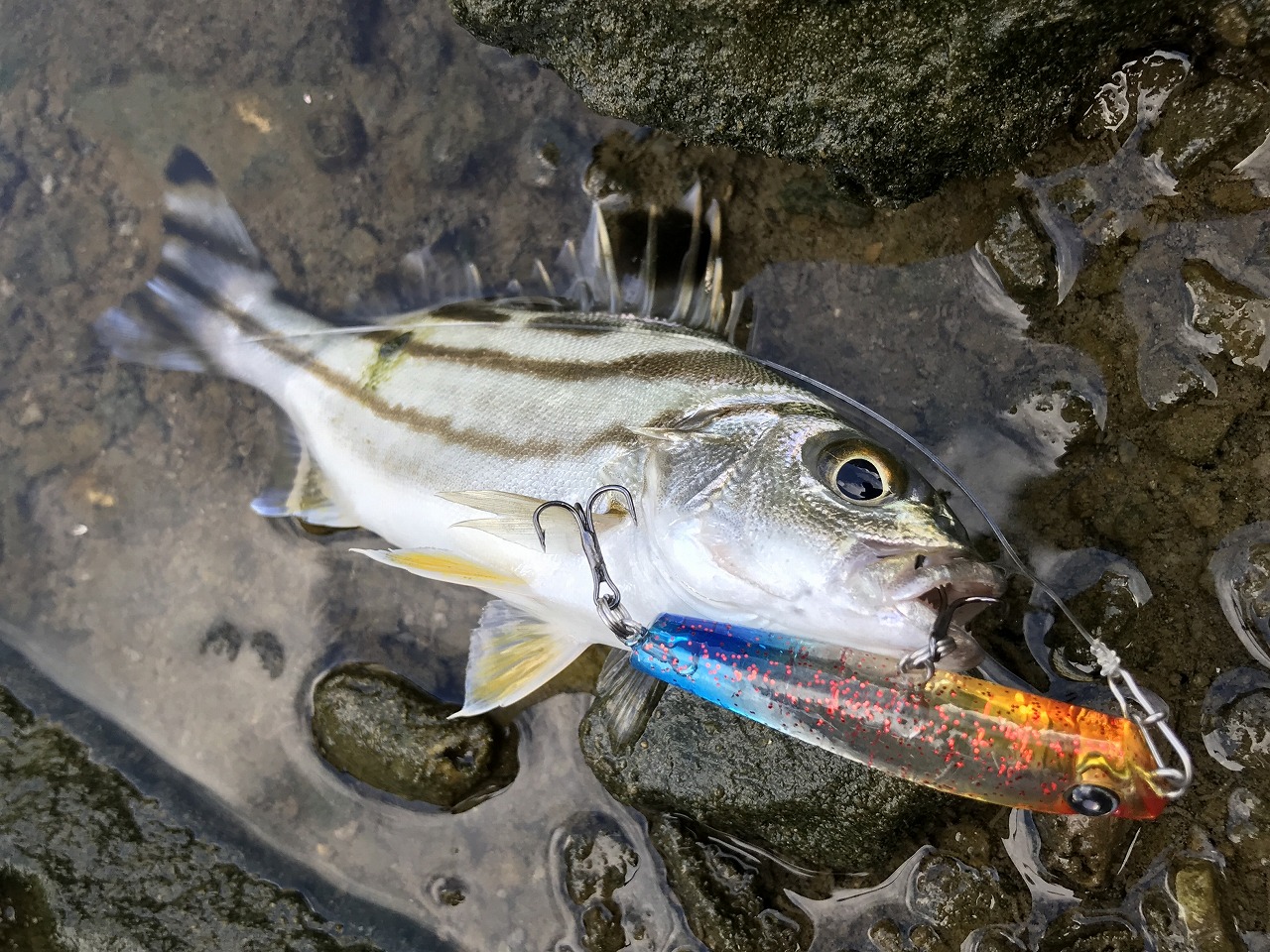 | 香港の河川にて。 トップへの反応は良いし、ヒットすればジャンプするしで楽しい魚。 だが大きな疑問がある。どこがストライプ? |