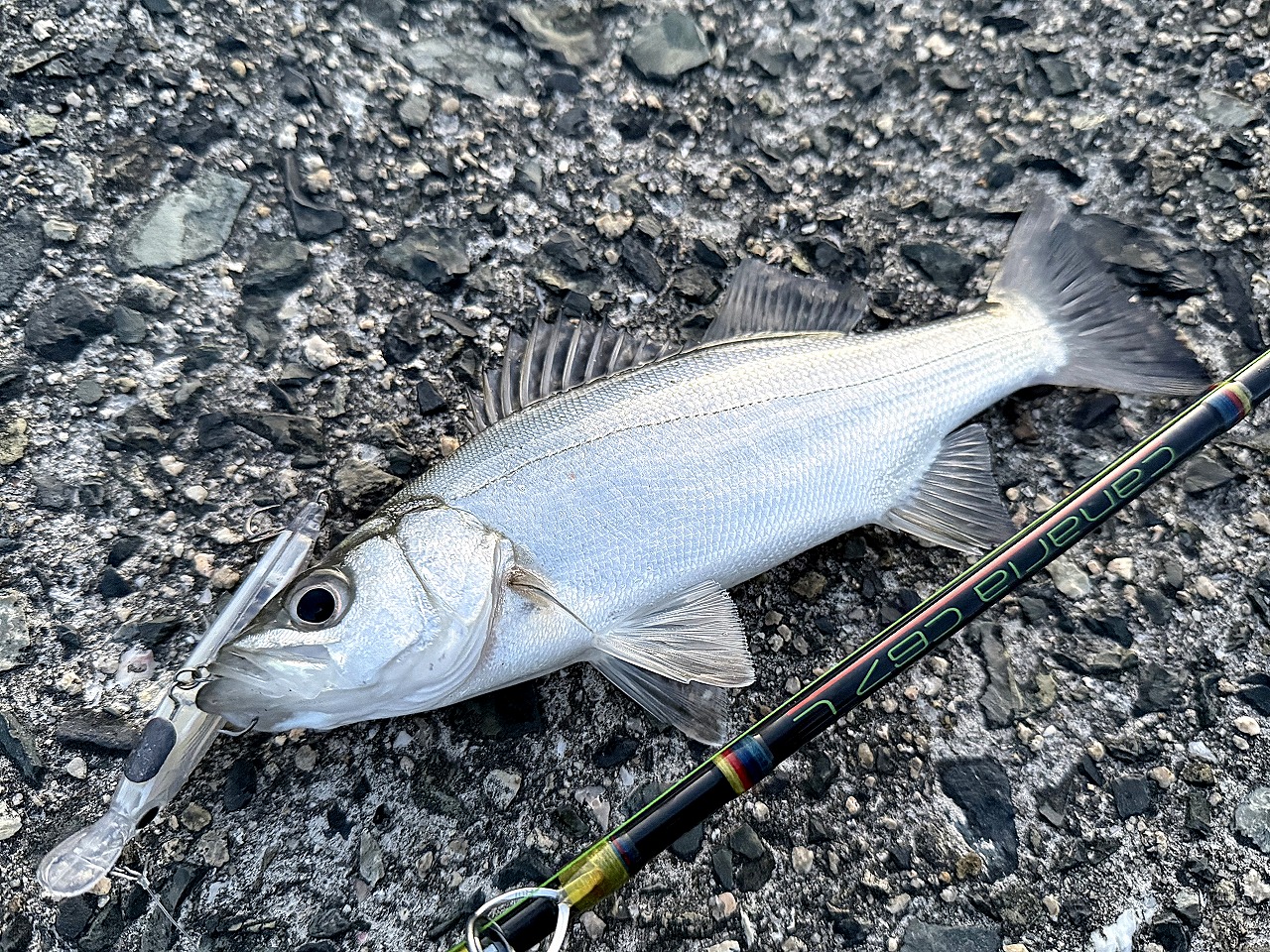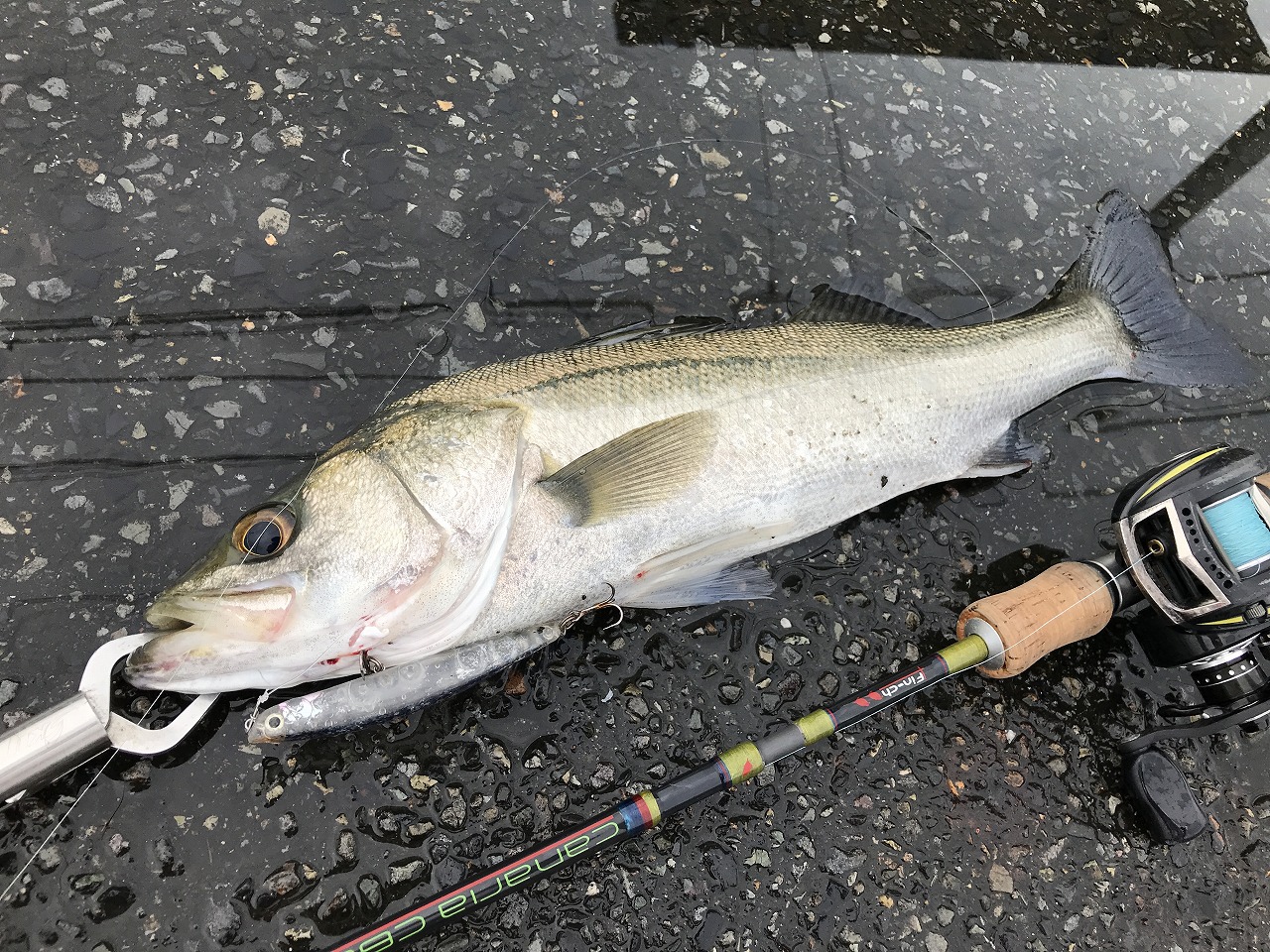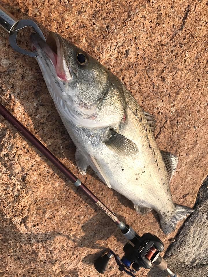| 地元下関の波止場にて。 釣った時はマルスズキと思ってたが、 マカオの友人に指摘され、ヒラスズキと気が付く。 |