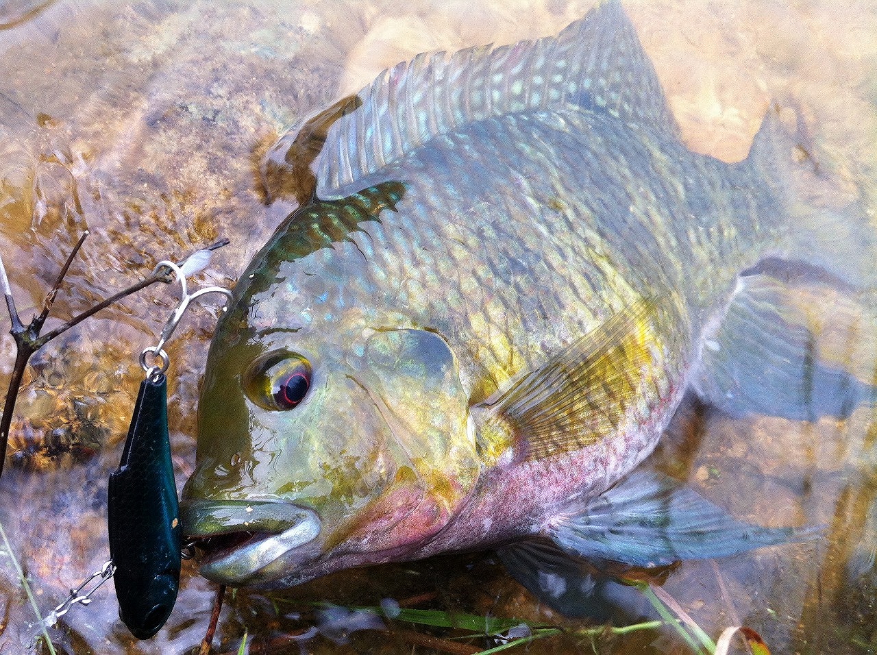 | 中山の河川にて。 日本のアカメより赤目。見た目でソンしてると思う。 実はサイズの割にパワーがあり、トップにも好反応。 |