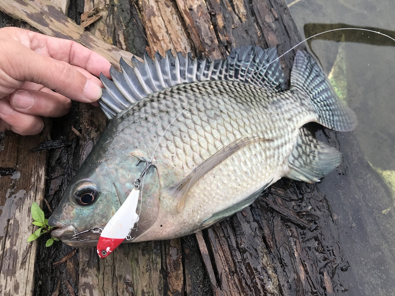 | 香港のダムにて。 ナイルテラピアに比べ小ぶりだが、 ルアーへの反応はコイツの方が良い。 |