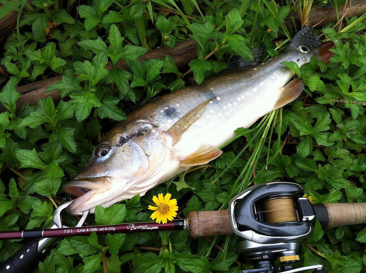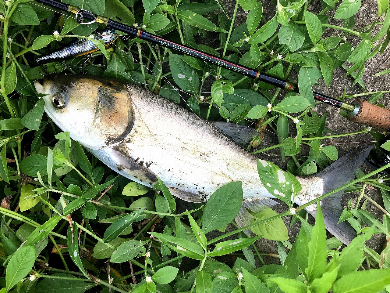 | 地元下関の河川にて。 帰国のタイミングが良かったのか、 日中でもトップでガンガン釣れた。 |