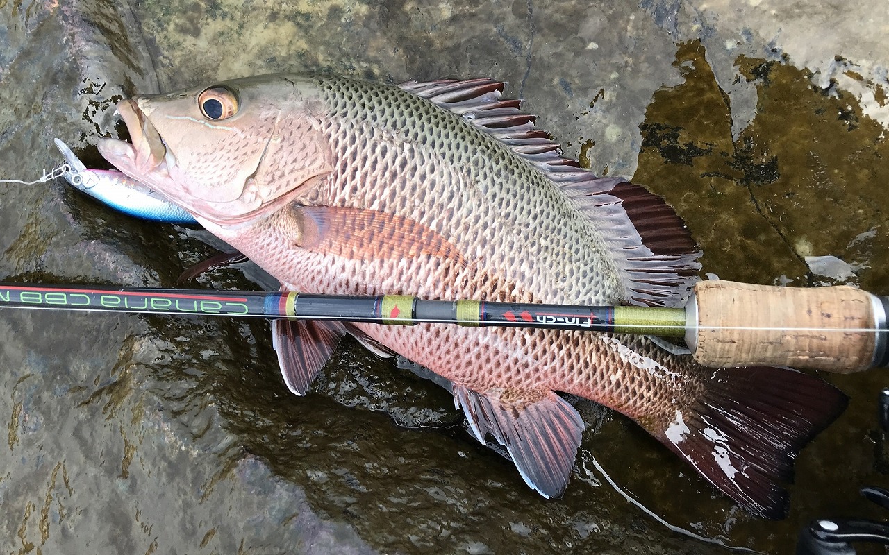 | 珠海の無人島にて。 ルアーに反応が良いらしいが、そんなに釣れてない。 こっちではチヌより貴重。 |