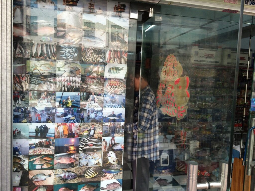 ショーウインドウには釣果の写真が並ぶ。