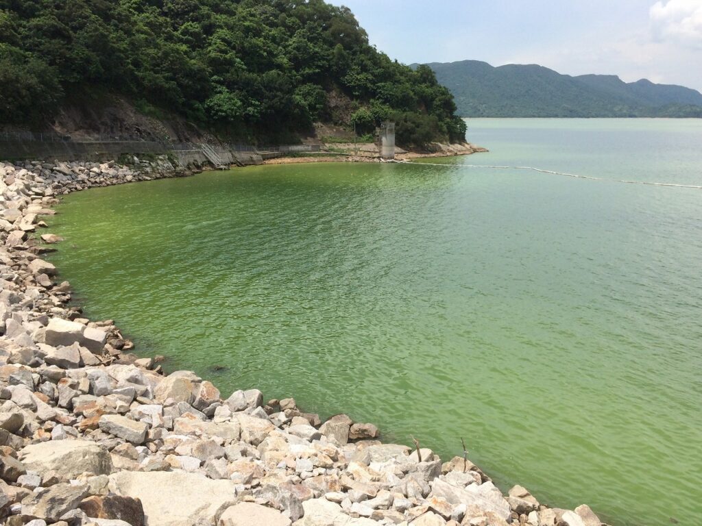 魚の姿を見て癒されたかったが、一面アオコで覆われてた。