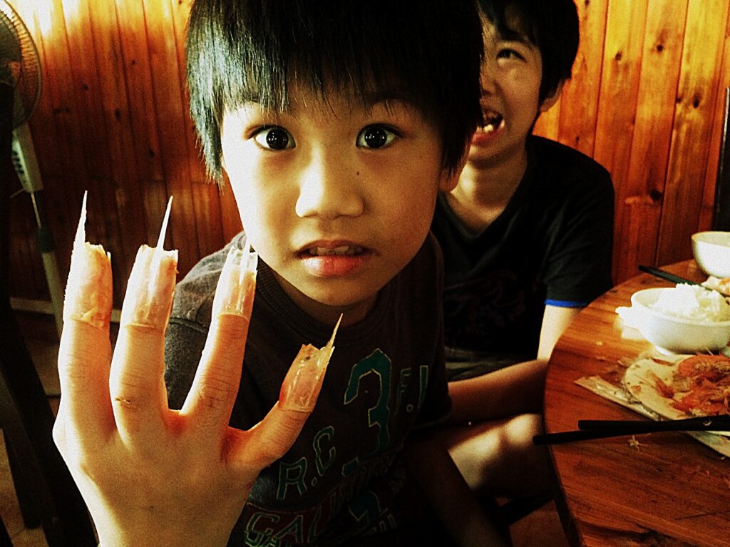 昼食で出た蒸し蝦の殻を指にハメて気合を入れる次男。