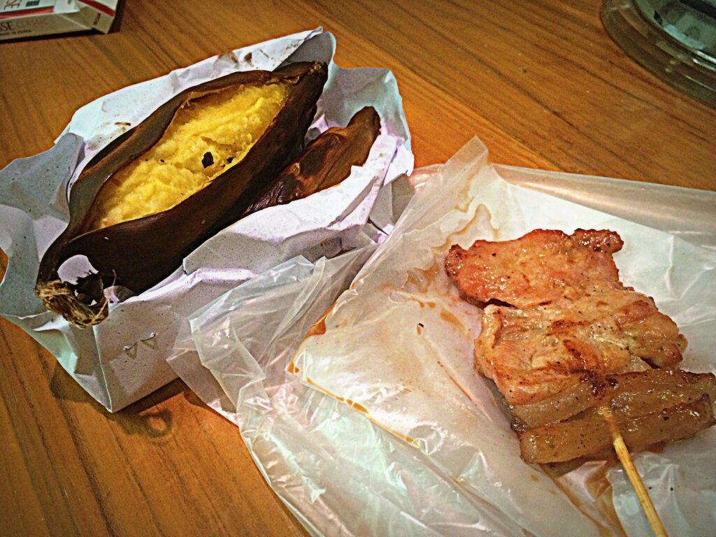 この日は焼いた台湾バナナと豚肉の串焼き。